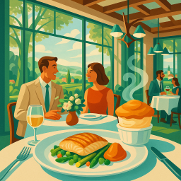 * Jetzt kann Peter das Abendessen mit seinen Freunden im Restaurant Troisgros - 'Le Bois sans Feuilles' Ouches genießen!