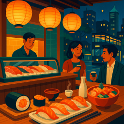 * Jetzt kann Peter das Abendessen mit seinen Freunden im Sushi Mori Tomoaki genießen!