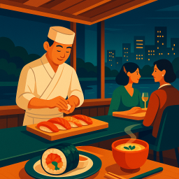 * Jetzt kann Peter das Abendessen mit seinen Freunden im Sushi Sakai Fukuoka genießen!