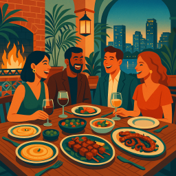 * Jetzt kann Peter das Abendessen mit seinen Freunden im The Peacock Mediterranean Grill Austin genießen!